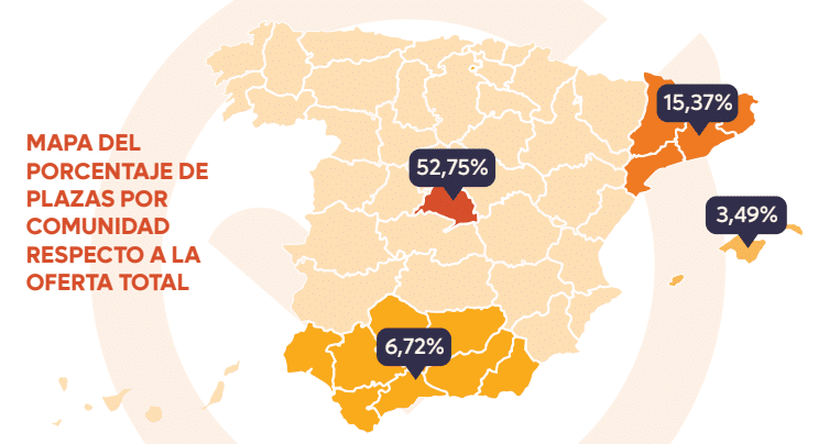 En este aspecto, es interesante consultar cuál fue el reparto de plazas asignadas en el último proceso cerrado, el correspondiente a la OEP 2021 y 2022. Ya sabes que las plazas no se asignan hasta el final del proceso, pero podemos fijarnos en las del proceso anterior. En el caso de C2, fueron Madrid, Cataluña, Andalucía y Castilla y León las regiones a las que más nuevos funcionarios de C2 llegaron.